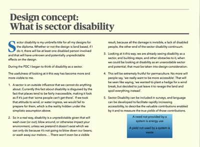 looking at disability as a sector in the permaculture framework, in order to better serve the principles of earth care, people care and fair share.